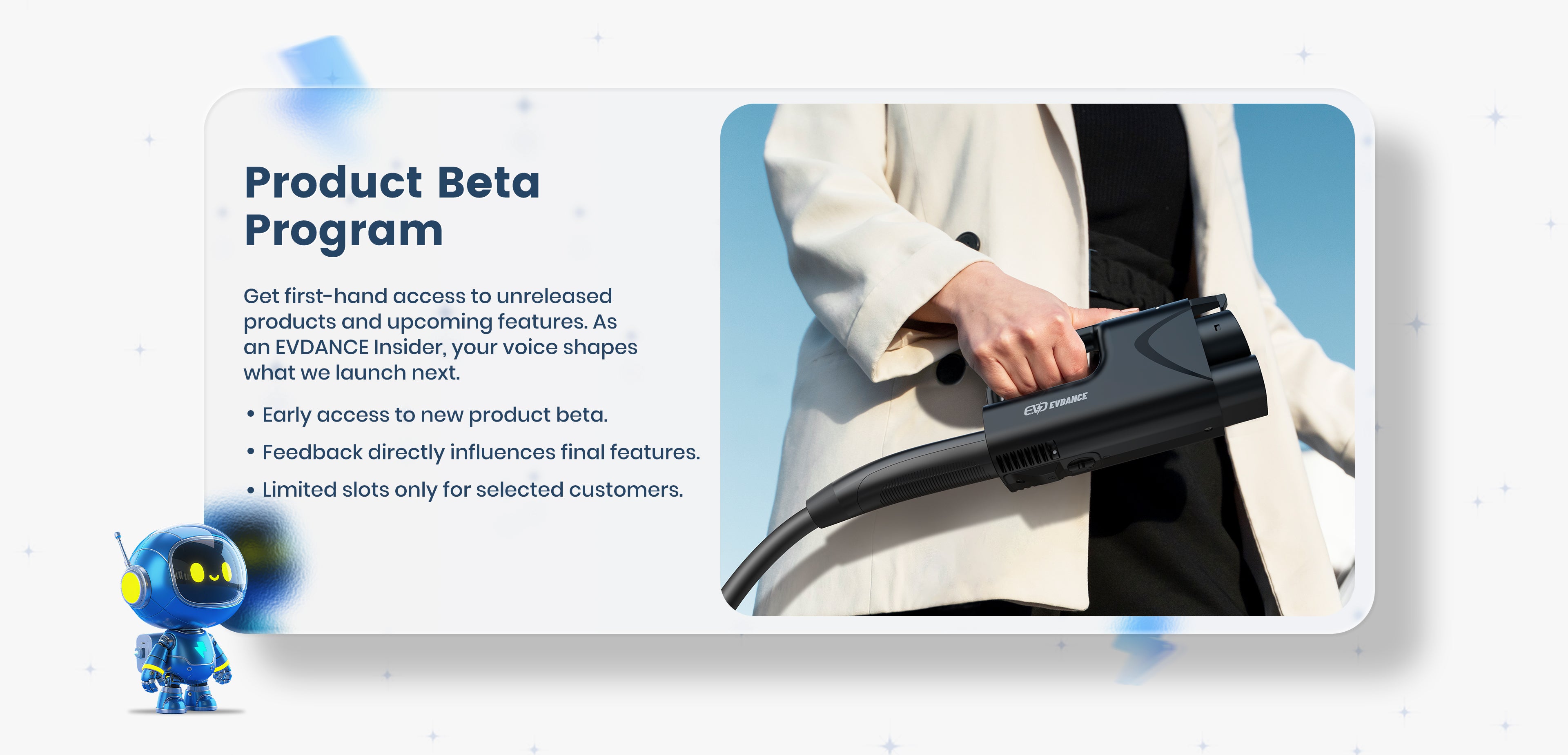 As part of the program, you’ll get early access to test our newest EV accessories before they’re released to the public. Every product is designed with consumers in mind, and your feedback plays a key role in shaping and improving our innovations.